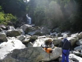 右岸から高巻き、懸垂なしで川床へ戻る。滝以外のところも渡渉をしながら進むのでなかなか