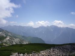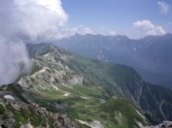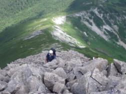 滝の右側を登っていく。ここで望月君と川辺さんが右の沢を登っていく。滝の上部ではつながっていなかったが、もう少し登れば、上流で合流していると思い。進んでいく。2350mで隣の沢と合流。ここで待つが、来ない。望月君を呼ぶと、下で声が、荷物を置いて下っていくと。隣の沢から途中でトラバースしてきたとのこと、ここから荷物のところまで戻り、小休憩。ここまであがってくると景色がきれいだ。本流から右にそれていたが、稜線はすぐそこに見えていたので、あがっていく。