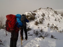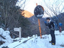 あるき沢橋から大学生隊と抜きつ抜かれつになる。あるき沢から急登が続き、凍っている個所もあり緊張する。学生が急登でスリップして3m位滑落したのにはビックリした。帰りではここの降りはアイゼン履こうとひそかに思う。あるき沢を越えたあたりから下山する人とすれ違うようになった。29日は、頂上は快晴で360度の大展望だったそうです。しかし、今日登った人は、強風で登れなかった人もいました。
