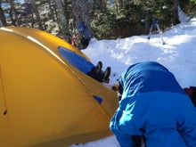 2300m付近では平地がありテントの跡もある。しかし、おしっこの跡が多数あって嫌がるメンバーがいたので、もう少しと欲張って進む。城峰手前でテントを張れるかと思ったが、積雪が少なく張れそうになく、そうこうしている内に城峰まで来てしまった。ここから先はしばらく急登になっていてテントは張れそうにない。疲労も濃くなってきたので、進むのは止めにして、15分ほど戻った先ほどの2300mで幕営することにした。