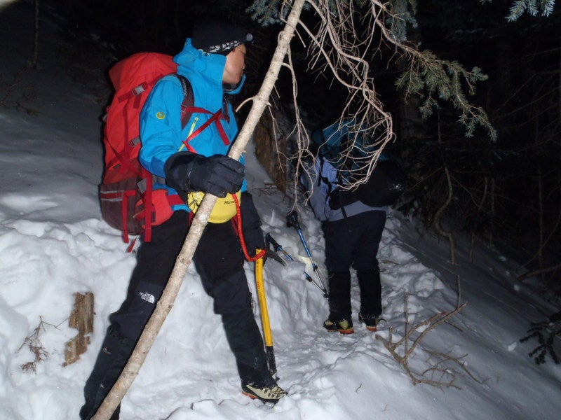 駐車場を暗いうちから出発する。星がきれいである。林道は所々凍結していて滑るので危険でひっくり返る人もいる。
