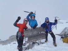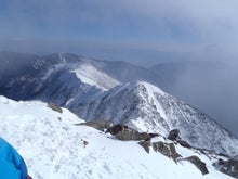 森林限界になっている砂払でアイゼン・メット・ハーネスを付けました。八本歯は慎重に歩けば危険な個所はありませんが、コルへの1ピッチのみ念のため懸垂をしました。メンバーによってはロープ無しでクライムダウン出来そうな傾斜です。ガスがかかっていて景色が全く良くありません。北岳山荘との分岐からは夏道沿いに急登を登って行き頂上に着く。頂上でもガスっていて展望が良くない。甲斐駒ヶ岳、仙丈ヶ岳とガスの切れた瞬間に見えるが、風も出ているので、記念撮影をさっさと済ませて下山する。