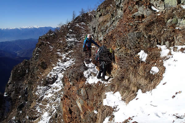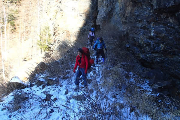 11:30鹿窓到着。雪もかなり少ないので夏道を行くことに。先に望月さん、井元さんが偵察。すぐあとに田邉君も下降する。足場はザレザレで、足を少し動かすだけでざらざら落石が起こるため、じっと待機。しばらくして望月さんから、ロワーダウンのほうがいいかもとの声があったので、田口さん深谷さんが支点を作成して下さり、深谷さんにロワーダウンしていただく。3人は荷物を背負ってここを下降したのだ。このまま強い3人に無事ついていけるかな? と少し不安になる。先に下降したA班はそのまま先へ進む。