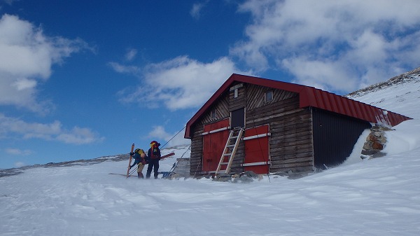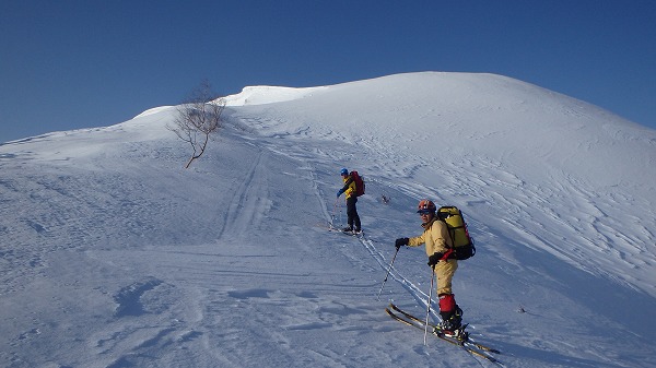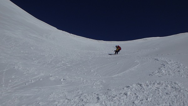 4時起き。単独登山者が出発。6時に小屋を出る。稜線に上がり弓折岳から滑り込む。大ノマ乗越までは雪庇が発達しており気を使う。大ノマ乗越からの大斜面がこの山行のメインだった。一気に600Mほどを滑る。ややクラストしているところもあったがちょうど良い感じで滑れた。下部はデブり地帯で苦労する。MOCHIさんとYKさんはサクサク行っていた。林道はストップスノーだったが、行きとあまり変わらないところまでにスキーで行けた。