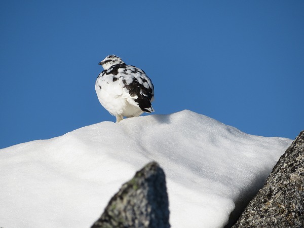 4:00起き6:00出発であった。朝の味噌汁が体にしみた。今日の行程はアップダウンのあまりない稜線の歩きだったのでとても楽しみだった。支度をし、アイゼンを履いた。稜線上は雪もあったり、しばらく土が続いたりといった道が続いていた。15分ほど歩いたところで、ライチョウに遭遇した。白いライチョウをみるのは初めてでとても興奮した。目の上の赤色も体、雪の白と良い対比となっていた。天気が良い稜線歩きなので楽しい以外の感情が湧かなかった。雪庇、ハイマツ、岩、青空。私たちだけがこの景色を味わっているのがもったいないくらいだった。7:00過ぎに大下りの頭に着き、小林喜作レリーフに着いたのが8:40頃であった。ここからは大天井岳への急登であった。アイゼン、ピッケルを使う良い練習になった。登り応えのある道を進み、山頂へは9:30頃到着した。ここから続く喜作新道、そして東鎌尾根。見下ろすとエメラルドグリーンの高瀬ダム。おーっと歓声を上げてから、黙ってじっと景色を見つめるということを繰り返した。30分ほど山頂で景色を楽しみ、常念山荘の方へ向かった。またこの辺りからは燕山荘で見た槍の角度と少しずつ変わってきて、それに注視しながら進むのも面白いものだった。常念山荘への途中にピークがいくらかあるものの、そこに登らずピークを巻いていくので体力的にはとても楽だった。また雪もアイゼンが必要ないくらいで10:30過ぎに外し、ツボ足で歩いた。危険なところなどなく、快適に雪山を味わえた。日中は暑く、行動水として500mlあったが雪を食べたりした。T.Sさんがシロップを持ってこようとしたが忘れたみたいで私(とE.Tさん)は少し残念だった。次のときは持ってこよう。東天井岳の南西のなだらかなところで、男性が片足を雪にとられて抜けないようでいた。T.Sさんが手伝いに入り、E.Tさんが励ましていた。E.Tさんは越百岳であった片足が抜けなかったこと(事件?)をT.Mさんにどうしようもなかったことだと示そうとしていた。私は気を付けようと決めた。この日も順調なペースであった。横通岳を過ぎ、しばらくしたところで常念山荘が見えた。それから、尻セードで少し遊び常念山荘に13:00過ぎに到着した。サイト地には雪がなく楽にテントを張ることができた。山荘で記念バッジと赤、白ワインを購入した。ビールで乾杯し、S.Tさんから頂いたチーズを食べながらワインを飲んだ。それも槍や穂高(少し雲に隠れていたが)を見ながらだったので贅沢だった。今日の晩御飯はパスタと麻婆春雨でお腹が満たされた。体力的にも時間的にも余裕があったので、私とE.Tさんで気象図を描いた。何度描いても難しいが、今回はT.Mさんからokを頂いたのでとりあえず安心した。この気象図で6(土)の天気予報を各々でしたのは良い練習になったと思う。結局、この日も早めに就寝した。