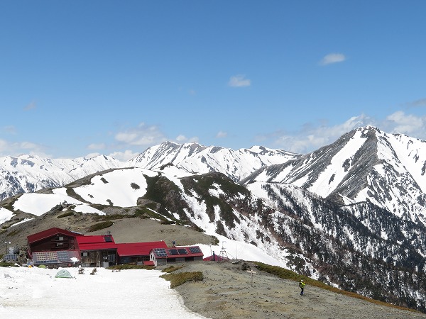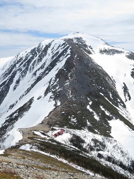 蝶ヶ岳ヒュッテと常念、大天井(これまで来た縦走路を見る)