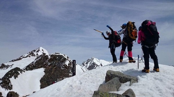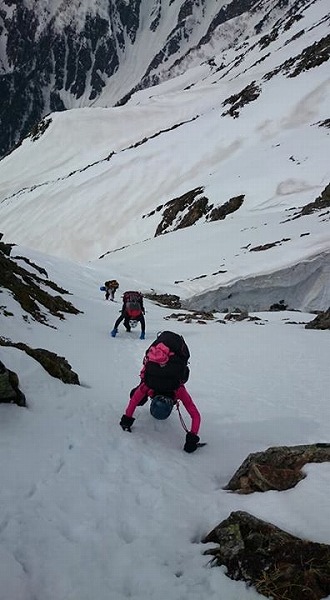 キレットの下りは、100mくらいの長いクライムダウンだった。疲れていたし、こんなに長いクライムダウンは初めてだったし、途中で下を見たら、まだまだ下っていたので、集中できるように、声を出して下る。ギャーギャー言いながら下ったので、私は怖くもなく集中できたが、「集中できないから静かにして下さい」とTok注意された。みなさん、ごめんなさい。