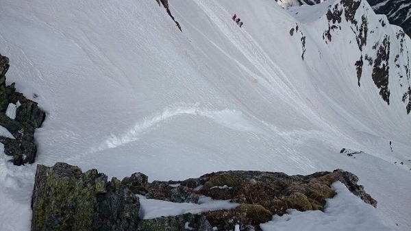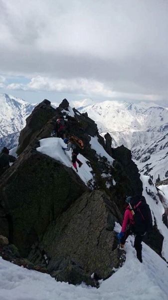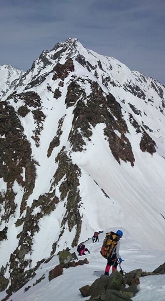 奥穂高岳からは、涸沢テント村が良く見えた。奥穂高岳から涸沢岳を越えて北穂に向かう。東京に行く前に蛍雪にいたときに、ドキドキしながら(夏に)北穂から涸沢岳を越えて奥穂まで縦走したことを思い出す。が、今回は特に問題なく涸沢岳を通過した。北穂への稜線で、ザラッとした雪が足元で崩れたと思ったら、しばらくして「雪崩~!!」という声が聞こえた。下を見ると、崩れた雪が引き起こした雪崩が沢を下っていた。後ろのTok、YYは、雪崩が発生する現場を、その目で見たそうだ。怖い。コルのところで、他のパーティーの人に、「私たちも、雪崩を起こすなと下の人から怒られたけれど、どうしようもないよね」と慰められた(?)。ザラ雪が足元で崩れるのを防ぐのは、岩を落とさないように歩くよりも難しい、というより、無理だと思った。とりあえず、私が引き起こした雪崩で事故が起こった訳ではなくて、ほっとした。