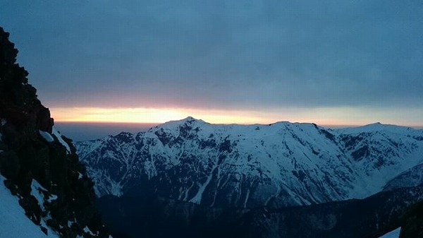 大キレットの登りは、夏道なら梯子のあと、階段らしい。梯子を越えたところで、右か左か迷って二手に分かれる。左手が夏道だった。梯子のあとの階段は雪に埋まっているようだ。大キレットの登りは、「気が付いたら着いている」などということはなく、「暑い」、「しんどい」、「疲れた」、「どこまで続くの」だった。南岳避難小屋が見えたときは、ほんとうに、嬉しかった。 南岳避難小屋は、トイレも2つあり、快適だった。12時間半の行動を終えて、快適な小屋の中で出てくる言葉は、みな同じ。ただただ「しんどい」「疲れた」・・・。
