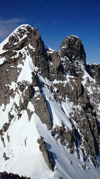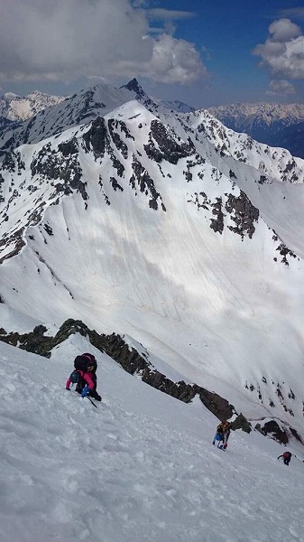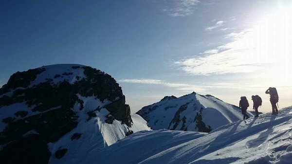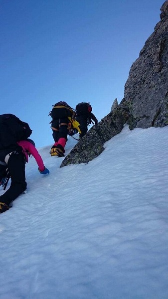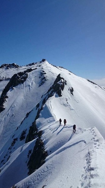 今日も、KH、Tokが先行する後ろを、徐々に離されながら必死で歩く。YYは、最後尾を歩き、写真撮影のために距離をあけたり、移動したりしてから追いつくというのを繰り返す。 ジャンダルムからロバの耳へ雪面をトラバースし、ロバの耳に登る。ロバの耳からは、残置の支点を使って2回の懸垂下降で降りた。2度目の懸垂の準備をしているときに、3人の若者が懸垂下降で降りてきたので、少し待ってもらう。