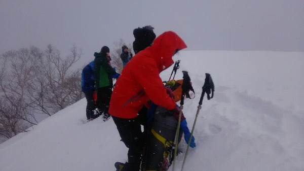 16日、8:15分から動き始めるテレキャビンに乗りアルプス平へ。準備を行い8:45スタート。スキー場を横切りながら歩く。天気は、遠くの視界がなく良いとは言えないが、無風で暖かい。リフトの終点、地蔵の頭を登り始めるところでワカンをつける。他登山者6名先行。トレース、時折トレースなしのところをラッセルしながら進む。雪がある程度締まっており歩きやすいが、ラッセルするには雪が重く、足が上がらずしんどい。しかし、先行6名+蛍雪8人いるので心強い。1950mあたりで先行パーティに追いつくが、1970m地点で休憩。再度先行パーティに追いつき、ラッセルを交代しながら歩く。中遠見で幕営予定だったが12:00であったため、テント場予定地に赤旗をたて、そのまま13時引き返しを目標に先に進む。大遠見までは届かず13:15に引き返す。14時にテント場に到着。