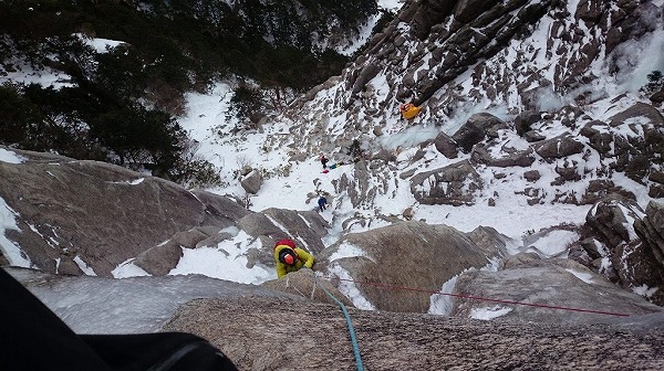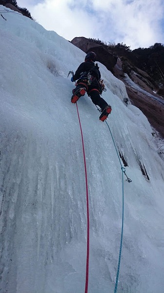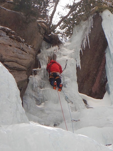 ビレイ点からテラスを右へトラバースし、そこから直上。見た目氷が薄そうだったが実際にはガッチリと厚く凍っており登り易い。途中垂壁部分で氷の表面がシャンデリア状でスクリューを決めづらく、しかもランナウトしていたためびびって往生したが、覚悟を決めて気合いで登りきり安定したテラスで支点確保。ここは緊張したが、これだけ大きな美しい氷を登るのは初めてにもかかわらず、全体として非常に快適なクライミングだった。ただ、濡れたロープが凍って硬くなってしまい、フォローのビレイでロープを上げるのに相当苦労した。ドライ加工した新しいロープが必要だ。(凍ったロープの場合は支点ビレイより折り返しボディビレイが有効)