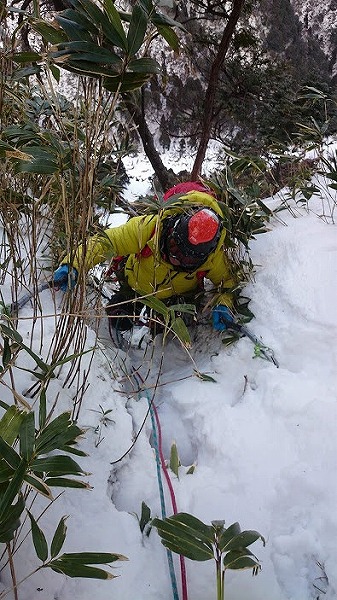 14:00 登攀終了。片付け後、中道登山道へラッセル