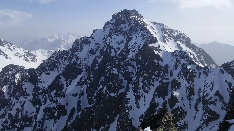 滝谷が目前に大きく見える。槍の上はガスで見えないが、つづく稜線は美しい。