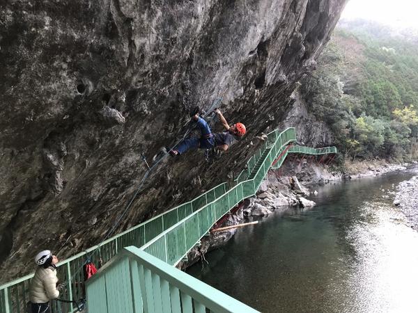 2日目(11/23)は遅れて合流した山田浩も含めて魚道エリアで思い思いに11台に挑戦する。天気は快晴で、岩場は暖かく快適だ。夕方に移動予定でもあり、正味半日ちょっとのクライミングだったが、結構成果もあり、楽しめた。