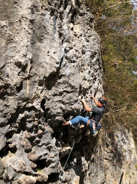 遊歩道エリアでは、タラチネ(5.11a)、バットマン(5.11b)などにチャレンジ。特にバットマンはエリアを代表する強傾斜(130度)ゾーンにあり、下里、田邉が繰り返しトライしたが惜しくもRPならず。望月、南條はタラチネを狙うも、下部ワンムーブが解決できず(そこさえ越えればガバが続く快適ルートなのだが)宿題に残してしまった。