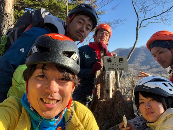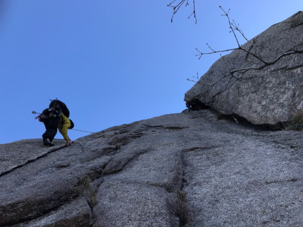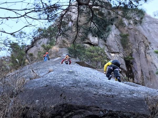 出だし5mほど、1ピッチ目と同じような微妙なフリクションスラブを行き、スラブのてっぺんに立った後はほぼ歩きで山頂へ。15時に登攀終了。ロープ、ガチャ等をまとめ、ハイキング道から下山。途中若干迷ったが、17時過ぎに駐車場に到着。日の出前から行動開始し、ちょうど日が暮れる頃に帰ってくることができた。残照に照らされた雄鉾岳が美しかった。夜は庵鹿川に泊まる。暖かい囲炉裏を囲み、充実感と安堵で夜は呑んだくれてしまった。