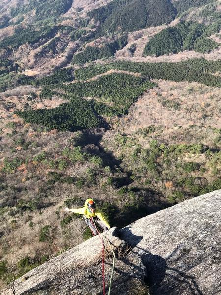 ここ数年、秋に九州へクライミング遠征に行くのが恒例となっている。今年は昨年同様、4日間のツアーを計画し、前半2日間は大分県・本匠の岩場で石灰岩のフリー、後半は宮崎県・鉾岳、比叡山でアルパインとボルダリングを楽しんだ。幸い遠征中は天気も恵まれ、多少寒い思いはしたものの、最高のコンディションの中でのクライミング、さらに全国各地のクライマーとの交流も楽しむことができた。
