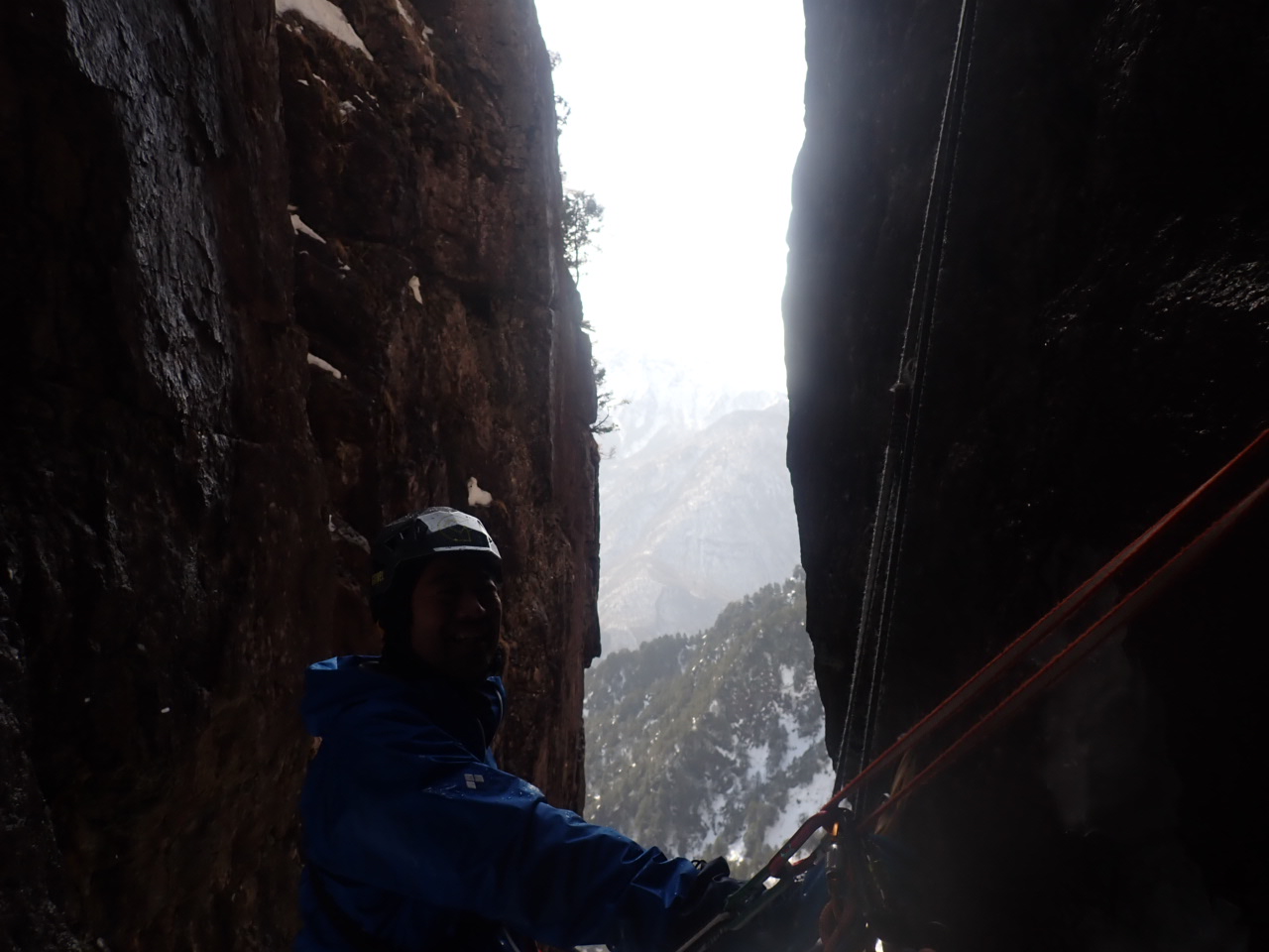 あとはカンテから雪壁へ移動し、カム2本でビレイ点を作って終了。