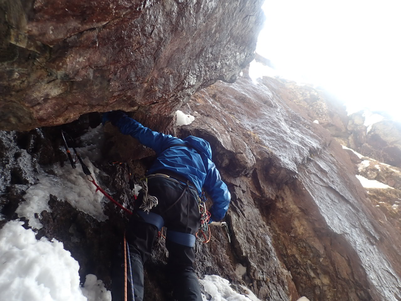 CSの下に潜りこんでカムを決め、一息つく。次に左の濡れたフェースを2mトラバース気味に登り、カンテに立ちこまなくてはならない。アイゼンはガリガリ岩を撫でるし、ホールドは全て丸っこい岩。ハイステップで爪先をスタンスに掛け、抜けそうなアックスを信じ上体を引き付けて立ち込む。あー、怖いコワイ。