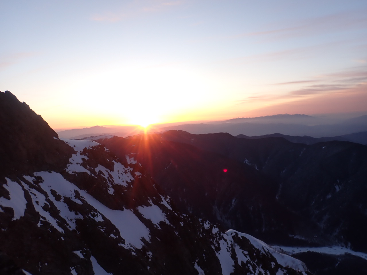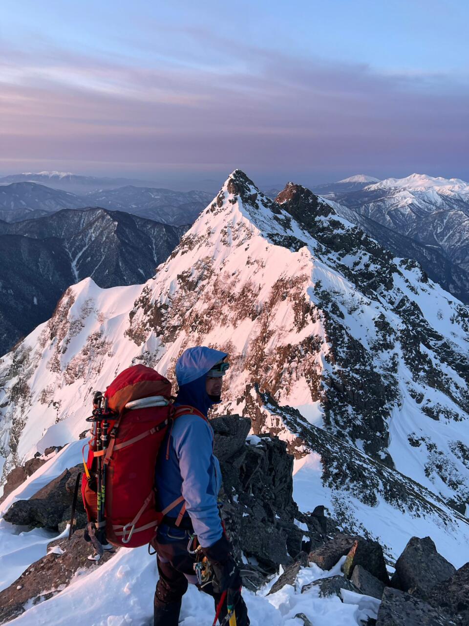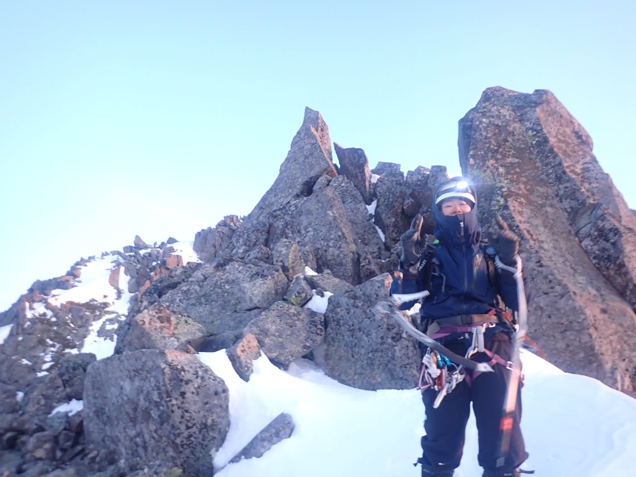 ナイフリッジのコルを渡り、雪壁を斜上。最後の岩場をワンポイントのクライミングで頂上へ抜けた。時計は17時。結構ギリギリだったけど、もう、これより上は無い。