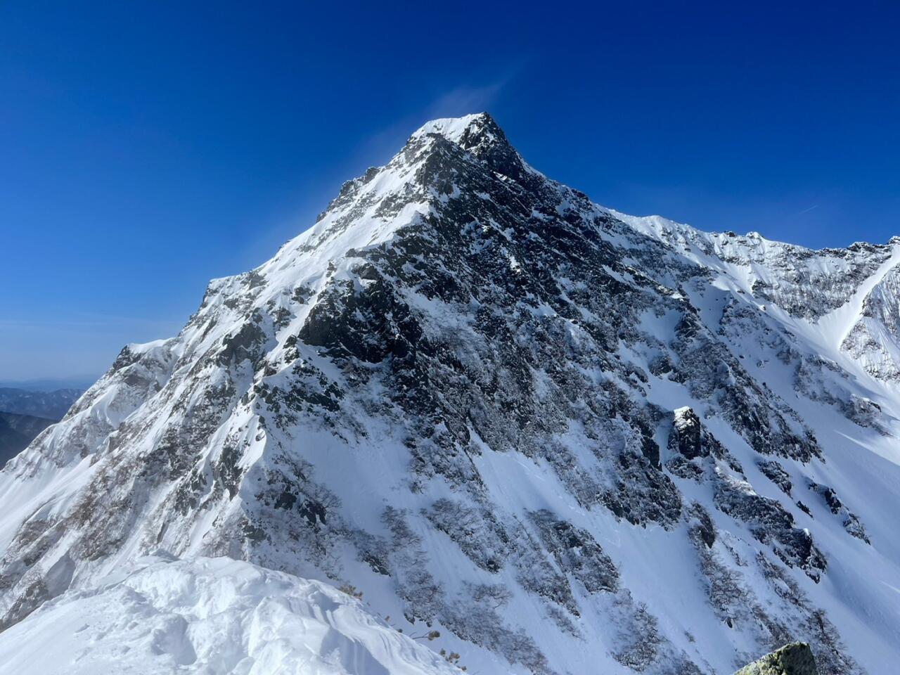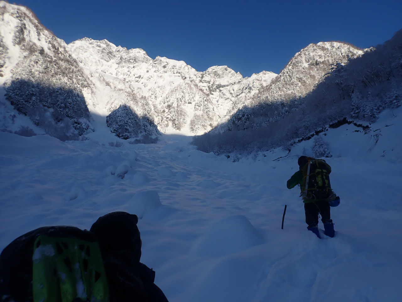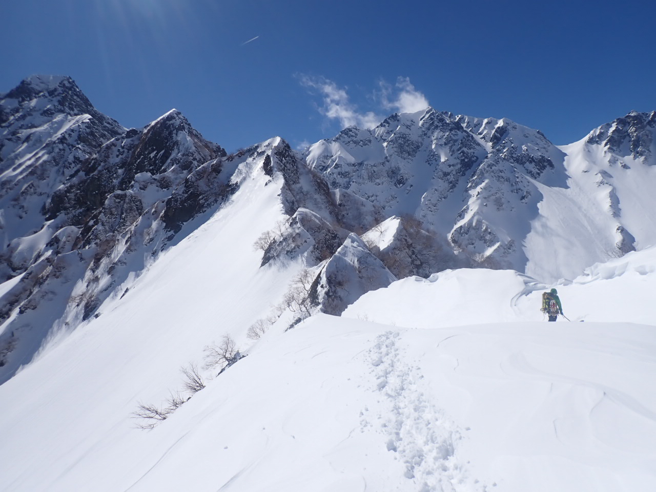 前方に北尾根の横顔を見上げる。屹立した東壁は黒い岩肌を見せなかなかの男前。前日とはうって変わり、真っ青な空で気分も上がる。デブリで覆われた谷をからパノラマ新道に沿ってラッセルで進む。目の前に見える慶応尾根のコルを目指すも一向に近づかない。山がデカすぎて、遠近感が狂ってしまっているようだ。