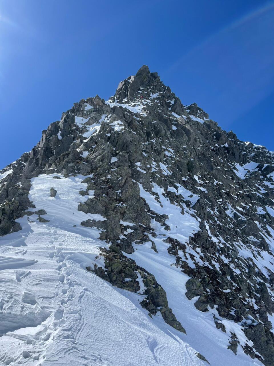 これまでとは違い岩の露出が多く、傾斜もきつい。上部には2本のチムニーが走る巨岩があり、登るライン取りによって難易度が大きく変わりそう。下部は浮石が多い岩のリッジで気を抜けない。