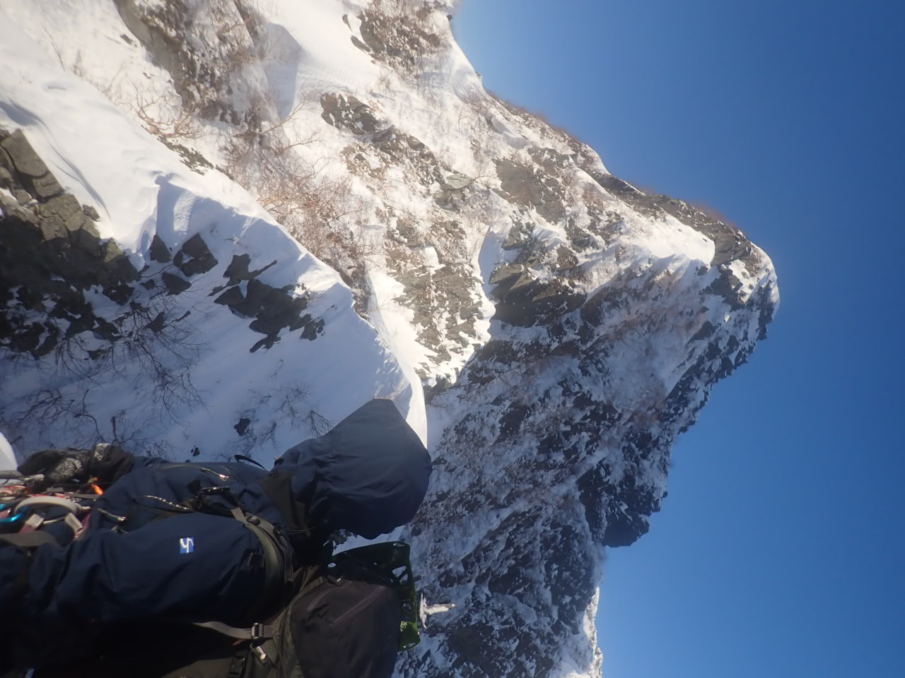 次はフォローの番だ。岡嶋を先にして同時登攀。トラバースを過ぎ、凹角から直上。浅いジェードルに入る。右手はスラビー、左手もホールドは無い。足を上げたいが薄被り。フォローとは言え、アイゼン、手袋に泊り装備背負ってのクライミングではなかなかキビシイ。両手のアックスも上手く使えない。四苦八苦しながら核心部を通過し、高度感抜群の浅いバンド状クラックを斜上したら、雪が浅く乗った草付き斜面を直上。岩稜上でビレイしている片岡のもとへ。ここに終了点は無く、ピナクルにシュリンゲを掛けてるだけのビレイ点。屈曲の多いルートでロープが重く、ここで切ったそうだ。