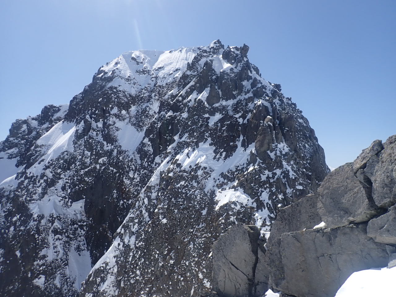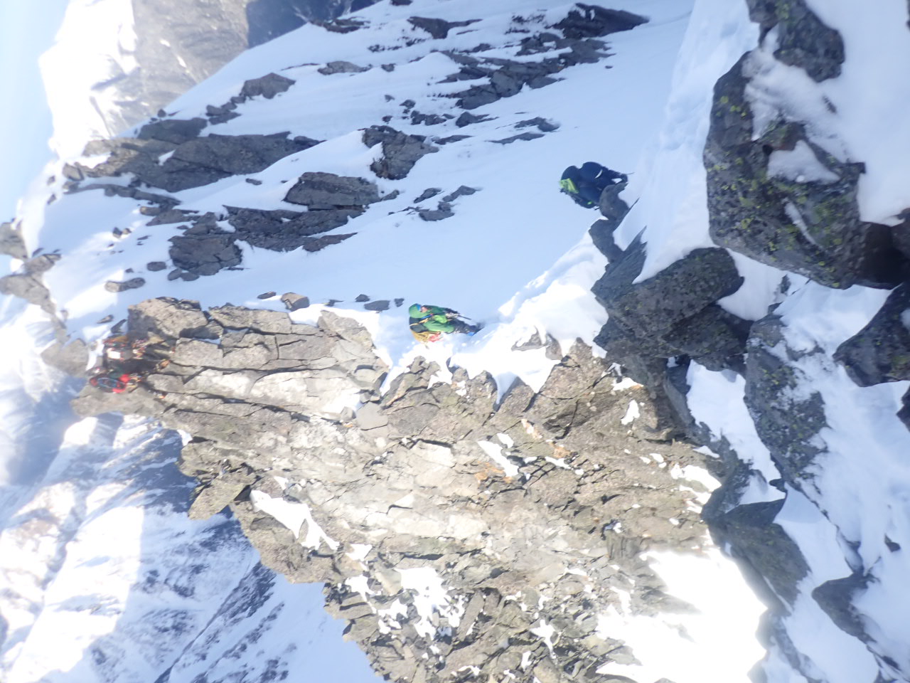 高度感のある雪壁。カリカリの部分と吹き溜まりの部分が交互に出てきてスリップしないか緊張する。ピークはハングした岩に守られているので岩稜の右にトラバースで活路を見出す。ここも高度感抜群で浮石や引っかけでバランスを崩さないように気を使う。長いトラバースの後、側稜から2峰ピークに上がる事が出来たが、ここも歩いては降りられない。コルまで短い懸垂。北尾根はなかなか許してくれない。